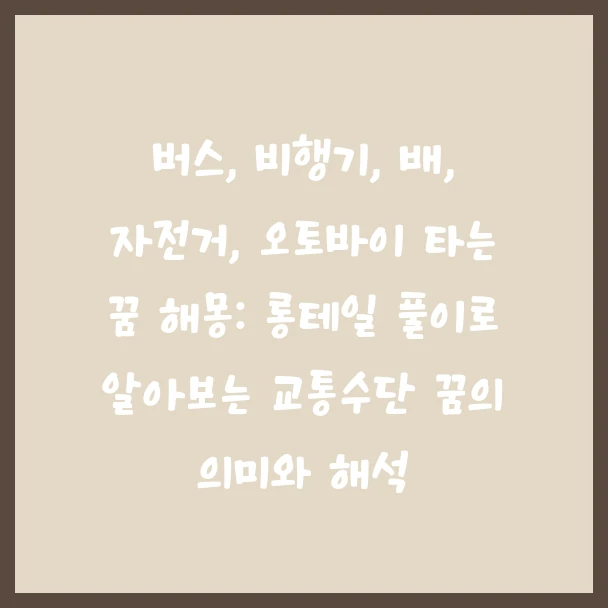 꿈은 우리 무의식의 반영이자 미래의 암시라고도 합니다. 그중에서도 버스, 비행기, 배, 자전거, 오토바이 등 이동 수단을 이용하는 꿈은 흥미로운 메시지를 담고 있을 수 있습니다. 과연 이러한 꿈들은 우리에게 무엇을 말해주고 있을까요? 함께 꿈의 세계로 떠나 자세히 알아보겠습니다.